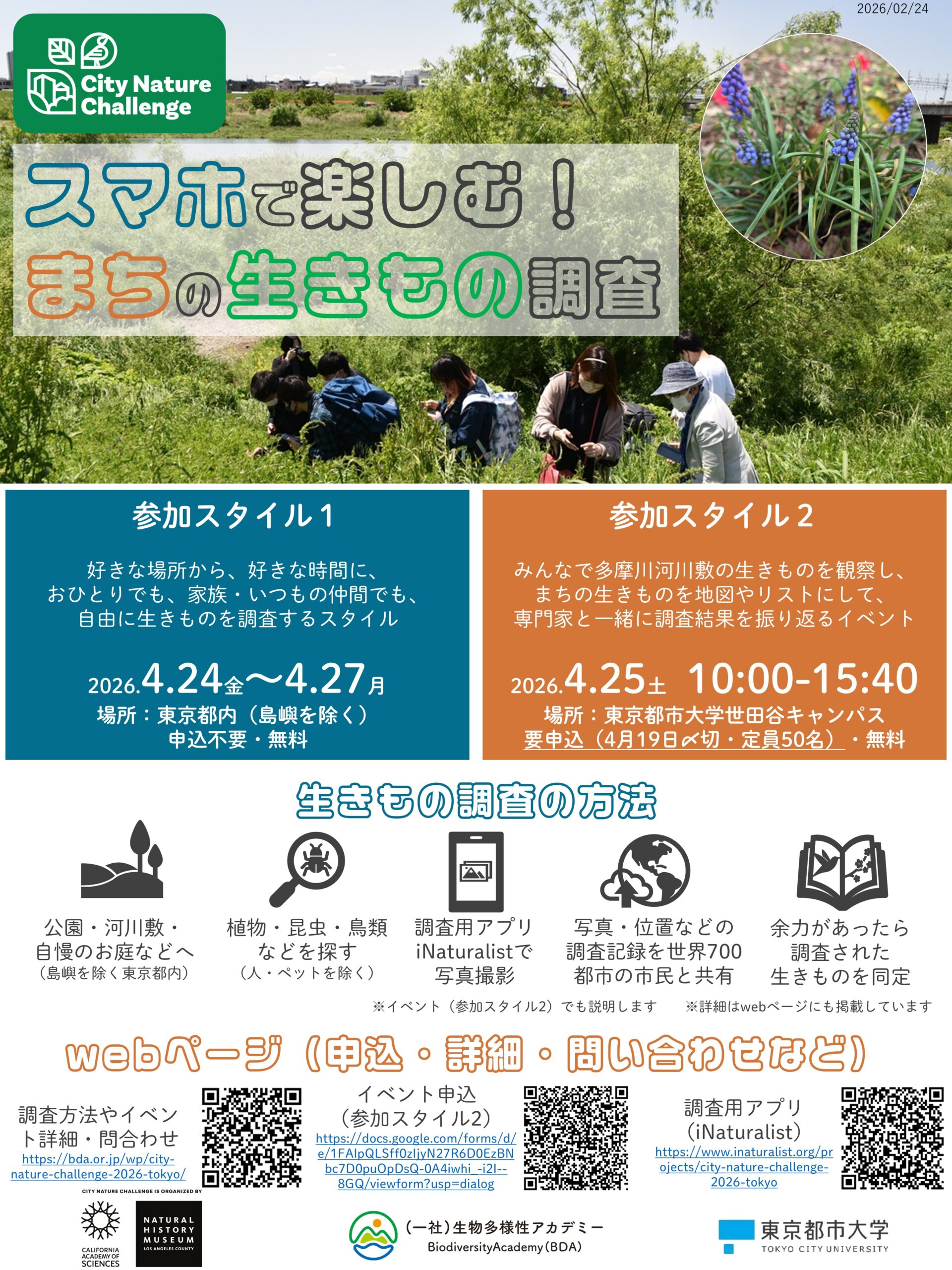 2026/02/25 City Nature Challenge 2026-Tokyoに関する案内ページを掲載しました。順次情報を更新します。